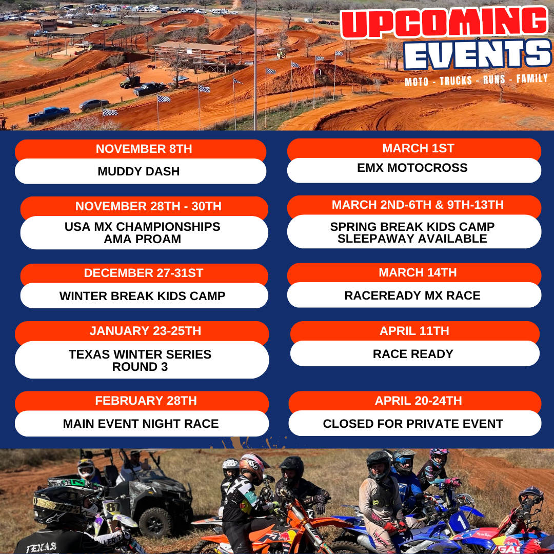 We have events for the dirt bike, off road community and beyond. Whether you are looking for motocross, kids camps, mud runs, off road trucks, side by sides. The family friendly atmosphere of Cycle Ranch makes it the perfect place to get away to nature for the day or long term with several camping options.