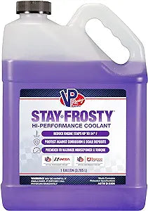 VP Stay Frosty Coolant is a specialized coolant designed for high-compression, high-heat engines, particularly in racing applications. It is formulated with a unique blend of wetting agents that enhance heat transfer, reducing cylinder head temperatures by up to 75 degrees Fahrenheit compared to conventional coolants. This coolant is pre-mixed with ultra-pure Reverse Osmosis water, making it ready to use without the need for additional mixing or dosing.